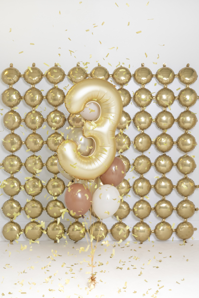 Narodeninový fóliový balón číslo tri, s jemným saténovým efektom, vhodný na plnenie vzduchom aj héliom.